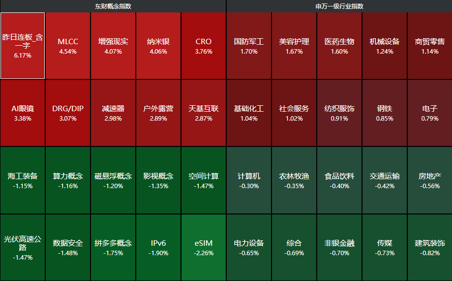 分行业来看,国防军工、美容护理、医药生物、机械设备、商贸零售等行业领涨,建筑装饰、传媒、非银金融、综合、电力设备等行业领跌。