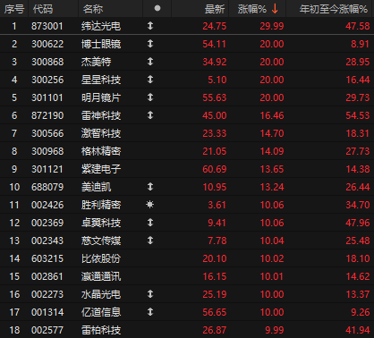 受以上消息刺激,今天AI眼镜板块掀起涨停潮,纬达光电、博士眼镜、杰美特、明月镜片等多股涨停。