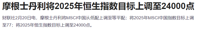 短期内,A股、港股都没有见顶的信号,就连嘴硬的大摩中国策略团队也翻多了。周三,摩根士丹利分析师Laura Wang领衔的中国策略团队发文表示,不再看跌中国股市,改持更乐观的观点,预计在技术突破的推动下,中国股市的涨势将更可持续。报告表示,中国股市(尤其是离岸市场)终于发生了结构性的质变,这让人比去年9月的反弹更加确信,MSCI中国指数近期表现的改善能够持续。大摩预计,预期MSCI中国指数到2025年底将升至77,较此前63的目标点位大幅上调,较周三收盘水平还言仍有4%的上涨空间。